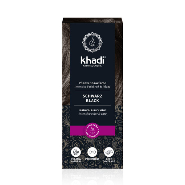 Esta coloración natural para el cabello contiene ingredientes efectivos como Índigo, Henna y Amla. El tinte natural colorea tu cabello de manera intensa y oscura. Como un barniz de color, los pigmentos vegetales se adhieren a cada hebra de cabello y lo nutren. Sentirás la resistencia y el volumen en tu cabello. Brillarán de manera saludable y mostrarán un negro natural. Khadi Negro es 100% natural y vegano, sin aditivos sintéticos como amoníaco, peróxidos o colorantes azo.